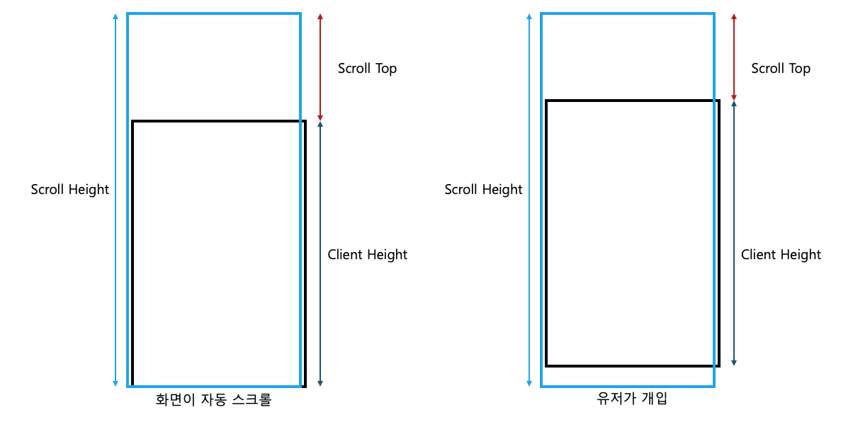 스크롤이 자동으로 진행되는 도중에 유저가 개입할 경우 Scroll 이벤트를 종료시켜야 하는 기능이 필요했다. 유저의 개입에 대한 판단을 이렇게 접근했다.- 스크롤 이벤트가 발생한다.- 유저가 개입할 경우 scroll height와 client height + scroll top을 비교해서 scroll height가 더 클 경우 유저가 개입한 것으로 판단한다. 유저의 개입 여부를 판단하는 로직을 스크롤 이벤트 내에서 처리하다보니 자동 스크롤도 스크롤 이벤트, 유저의 개입도 스크롤 이벤트로 처리되어 간헐적으로 유저의 개입에도 자동 스크롤 상태가 유지되는 경우가 있었다. 유저가 개입 상황을 판단하는 방식을 다르게 생각했다.- 모바일 환경이라면 유저가 터치를 통해 개입할 수 있다.- PC 환경이라면 MouseE..
